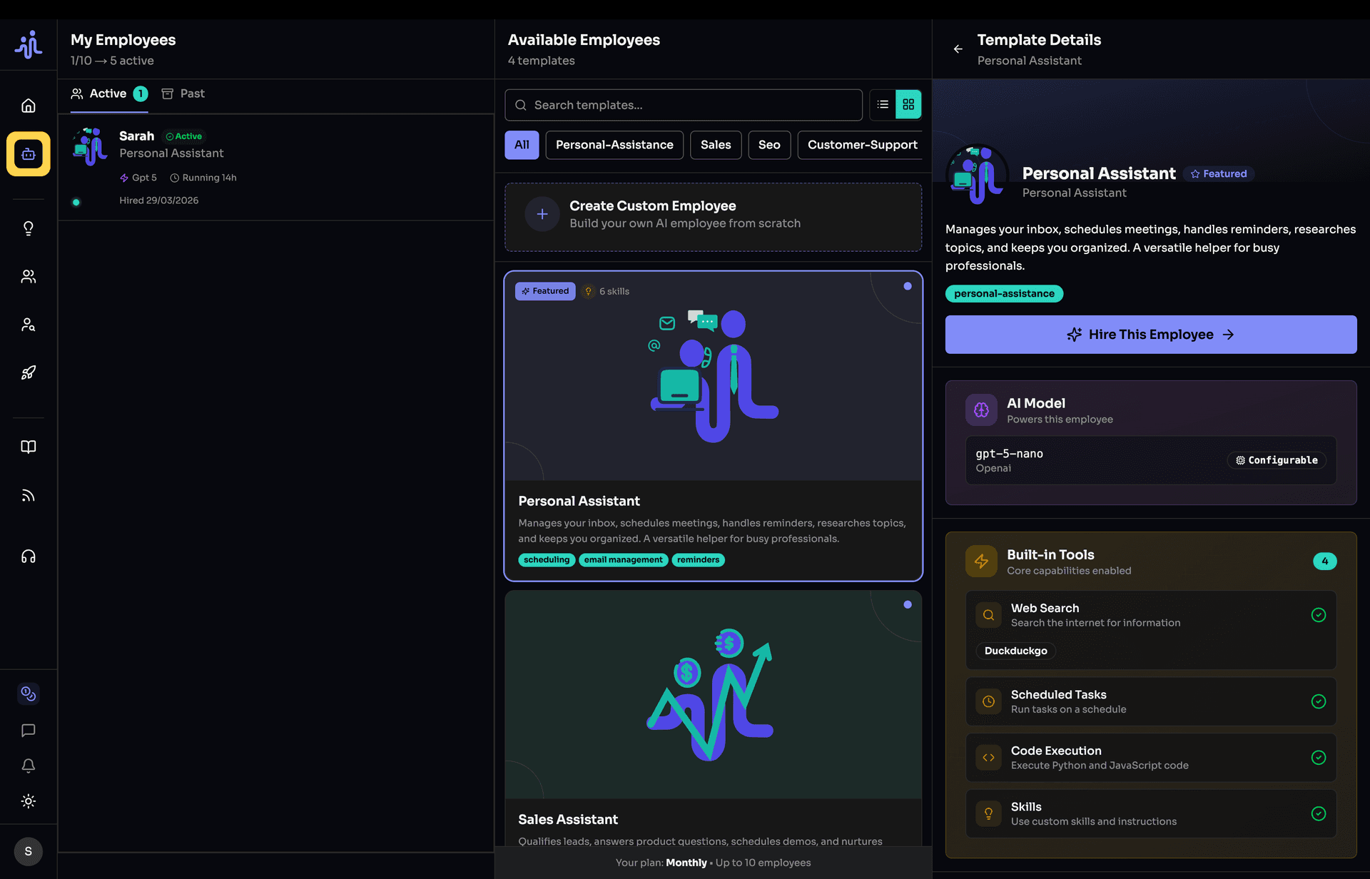Your subscription determines how many employees you can have active simultaneously. When subscribing, you choose how many employee slots you need (1-10).